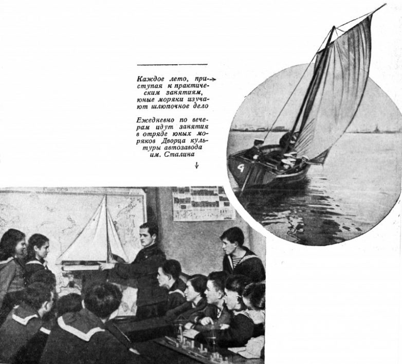 На третьем — Ленинград, политработник морского клуба Осоавиахима И. П. Лалик проводит среди юных моряков беседу по вопросам текущей политики. К слову, в 1938 году в городе на Неве была основана Морская школа