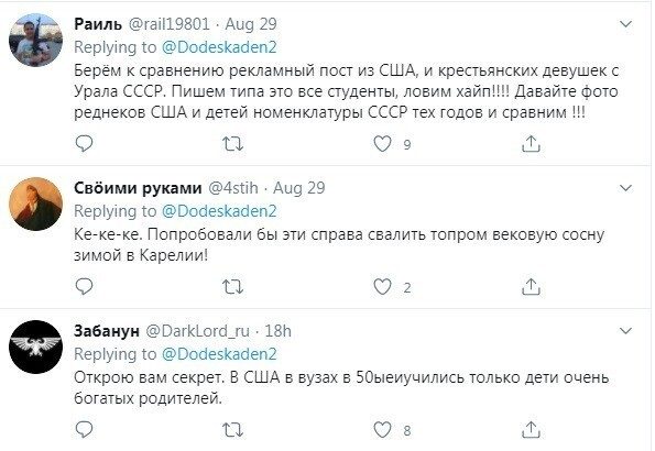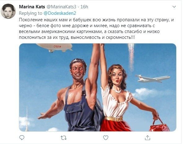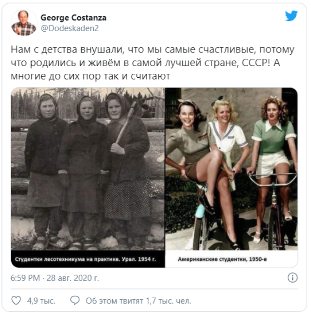 Предприимчивый пользователь твиттера Dodeskaden2 слепил коллаж из двух фото, на которых были изображены советские и американские девушки из 1950-х годов. Но вот только американки белозубо улыбались в коротеньких шортиках, а наши позировали на практике зимой тепло одетые. Автор поста ехидно прокомментировал свой коллаж.