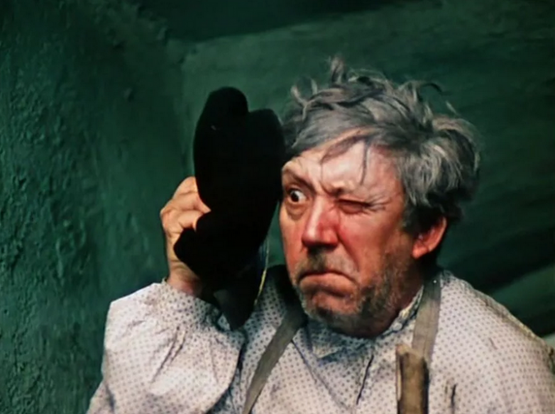 Обратите внимание на его руки, когда Остап предлагает выпить. И после, в дворницкой, когда Остап разливает водку, а потом спать укладывается.