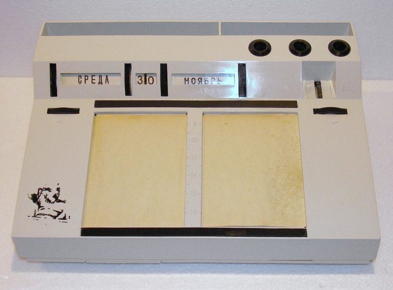 Дата выставляется поворотом колесиков. Рулонная бумага для ежедневных записей быстро закончилась. Радиоприемник хорошо ловил две программы: «Маяк» и местное радио. Электропитание 9 вольт от кроны. Цена 22 рубля.