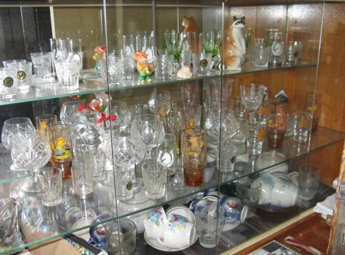 Такая композиция была обязательной в каждом доме! Это своего рода символ благополучия. Когда в гости приходили друзья, родственники, из серванта с почетом доставали лучшие рюмки, сдували с них пыль, ставили на стол. Сегодня в таком предмете обстановки совершенно нет нужды. А еще хрусталь… Признайтесь, что современная посуда на порядок красивее и интереснее!