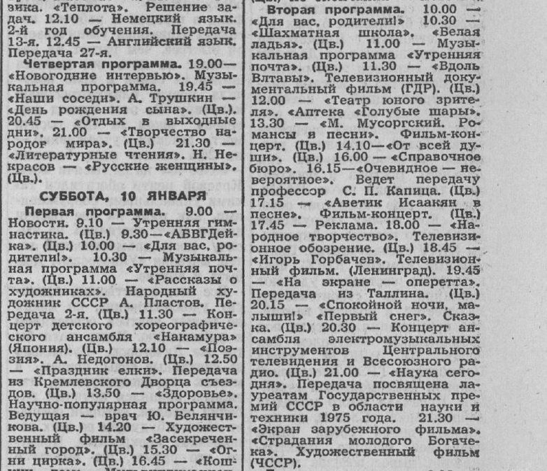 Кстати, кто сказал, что был всего один телевизионный канал? Неправда. У меня в руках телевизионная программа на неделю, напечатанная в газете Известия от 3 января 1976 года. В ней чёрным по белому 4 программы.