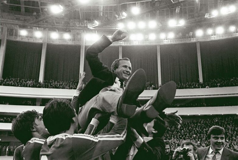 21 ноября впервые в своей истории Ленинградский «Зенит» становится чемпионом СССР по футболу. В решающем матче в СКК со счётом 4-1 обыгран харьковский «Металлист». На снимке — качают главного тренера Павла Садырина.