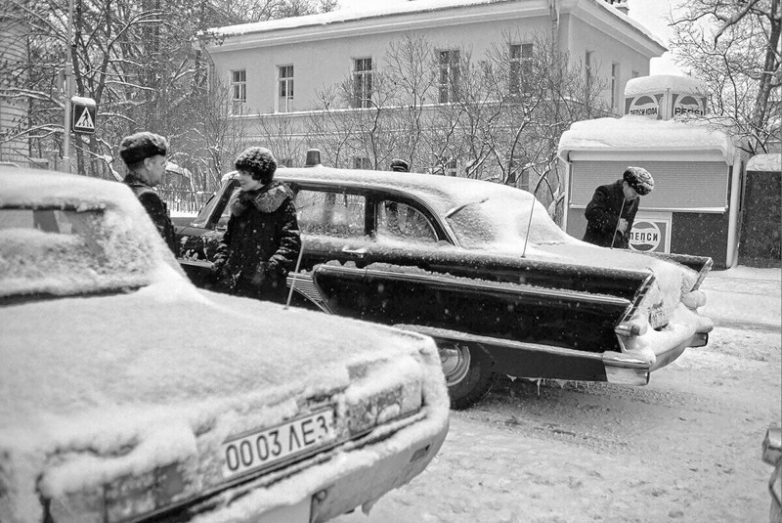 Какой-то невероятно киношный снимок с Садовой улицы в Пушкине. Дорогие машины, снегопад, ларёк «Пепси» на заднем плане.