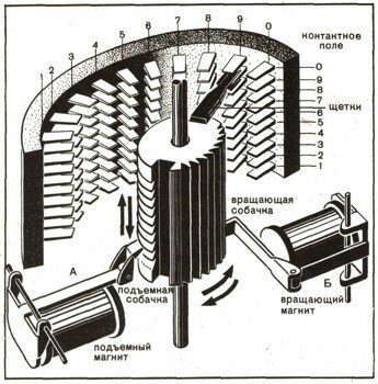 Когда вы набираете, скажем, номер «5», подъемный магнит А поднимает барабан на 5 шагов. Дальше магнит вращения Б, так же шагами, ищет свободный выход на ДШИ следующей ступени. Следующая цифра набираемого номера поднимает барабан найденного ДШИ, ну и так далее.