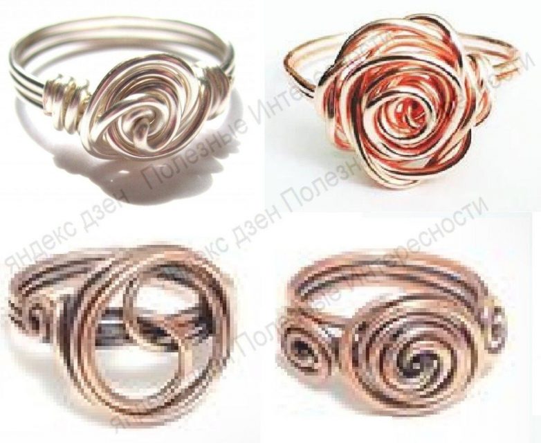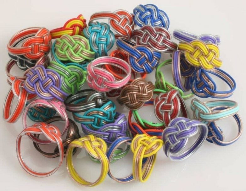 Прежде всего кольца. Плели их в основном из телефонных многоцветных и эмалированных медных проводов. Было 5 или 6 основных узоров и методик плетения. Различных комбинаций узоров-не счесть.