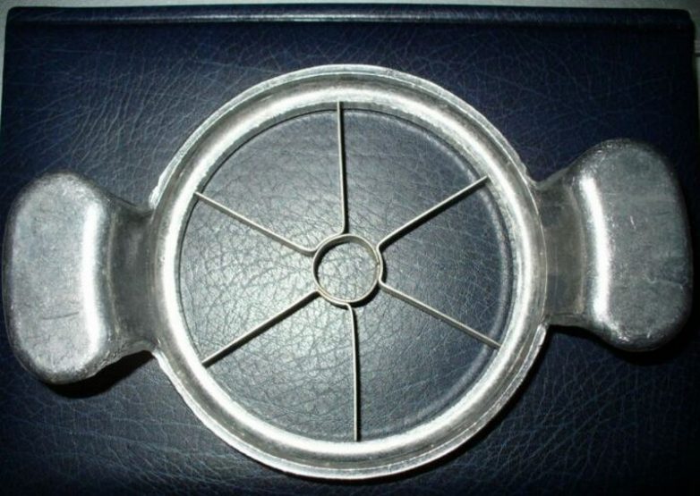 Это не руль от велосипеда и не крышка от фильтра пылесоса. На самом деле это достаточно тривиальная яблокорезка, позволяющая расчленить вкуснейший фрукт на более-менее равные дольки. Достаточно было положить устройство на яблоко и хорошенько нажать. Самое главное в том, что яблокорезка также позволяла вырезать сердцевину с косточками.