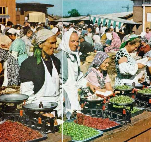 Никсон по этому поводу рассказывает читателю: «В каждом советском городе есть такие рынки, где крестьяне могут продавать излишки своей сельскохозяйственной продукции». А фотограф Энтони Стюарт сказал: «Мы нашли самое дружелюбное лицо Москвы». Это сказано про одну из продавщиц ягод. Кстати, там только крыжовник и красная смородина. Это разгар лета.
