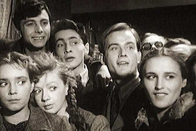 Вячеслав Тихонов (в верхнем ряду второй слева) и Нонна Мордюкова (справа) в фильме «Молодая гвардия», 1948 год