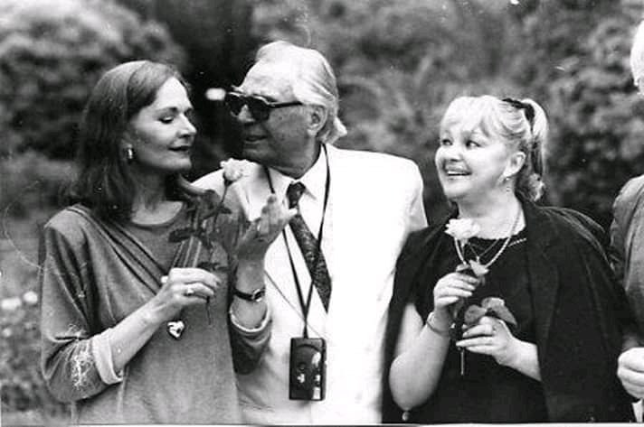 Артист Евгений Матвеев обнимает сразу двух очаровательных актрис — Наталью Гвоздикову и Людмилу Чурсину.