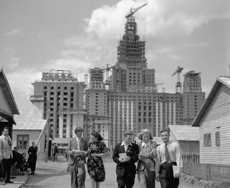 Строительство главного здания МГУ. Слева с фотоаппаратом корреспондент Яков Халип, 1951