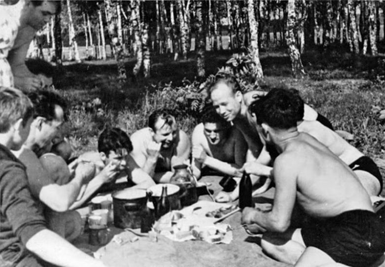 Космонавты Юрий Гагарин, Алексей Леонов, Борис Волынов, Виктор Горбатко с друзьями на пикнике в Долгопрудном; 1963 год. Фото из семейного альбома А. Алиева