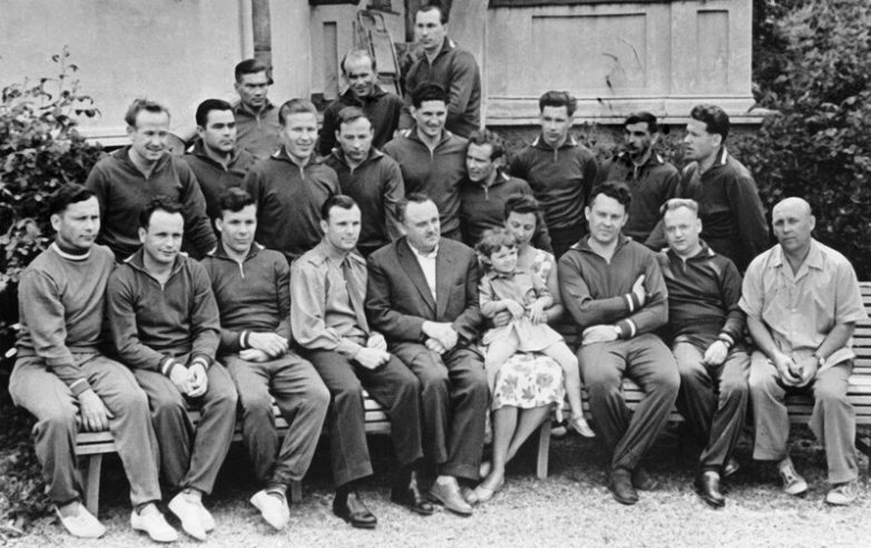 Первый отряд советских космонавтов на отдыхе в Сочи; май 1961 года. В первом ряду (слева направо): Павел Попович, Виктор Горбатко, Евгений Хрунов, Юрий Гагарин, главный конструктор Сергей Королёв, Нина Королёва с Наташей Попович, руководитель отряда космонавтов Евгений Карпов, тренер по парашютной подготовке Николай Никитин, врач Евгений Фёдоров. Во втором ряду (слева направо): Алексей Леонов, Андриян Николаев, Марс Рафиков, Дмитрий Заикин, Борис Волынов, Герман Титов, Григорий Нелюбов, Валерий Быковский, Георгий Шонин. В третьем ряду (слева направо): Валентин Филатьев, Иван Аникеев, Павел Беляев. РИА «Новости».