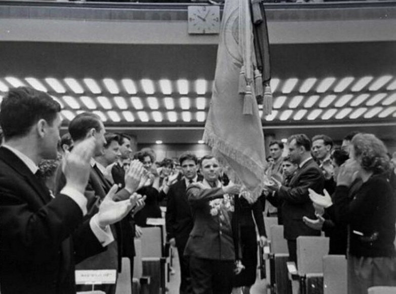 Лётчик-космонавт Юрий Гагарин вносит знамя комсомола в зал Кремлёвского Дворца съездов во время открытия XIV съезда ВЛКСМ; 16 апреля 1962 года. РГАНТД. Арх. № 1-13666