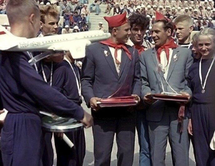 Лётчики-космонавты Юрий Гагарин и Герман Титов в пионерском лагере Артек; сентябрь 1961 года