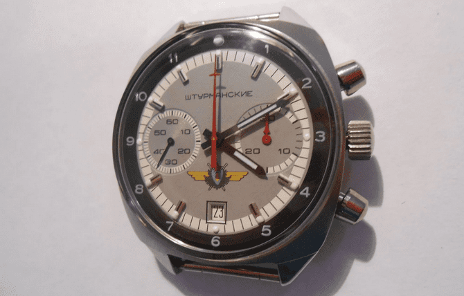 1. Часы — хронограф «Штурманские» производства СССР, обладающие высокой точностью хода. Корпус изготовлен из нержавеющей стали. Есть функция «Стоп секунда», позволяющая выставлять время с точностью до одной секунды.
