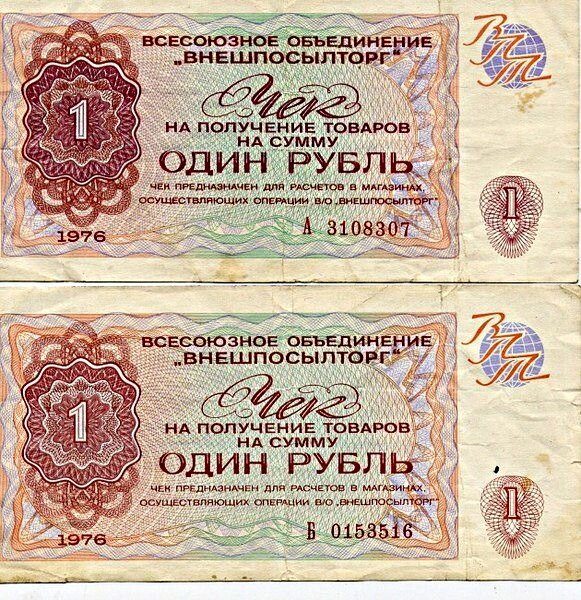 Сертификаты с синей полосой выдавались тем, кто работал в социалистических странах. Сертификаты с синей полосой выдавали тем, кто работал в развивающихся странах, например в странах Африки и получал их валюту. Для тех, кто работал в капиталистических странах и получал зарплату в валюте, были чеки без полосы. Сертификаты с красной полосой ходили только в системе Военторга.