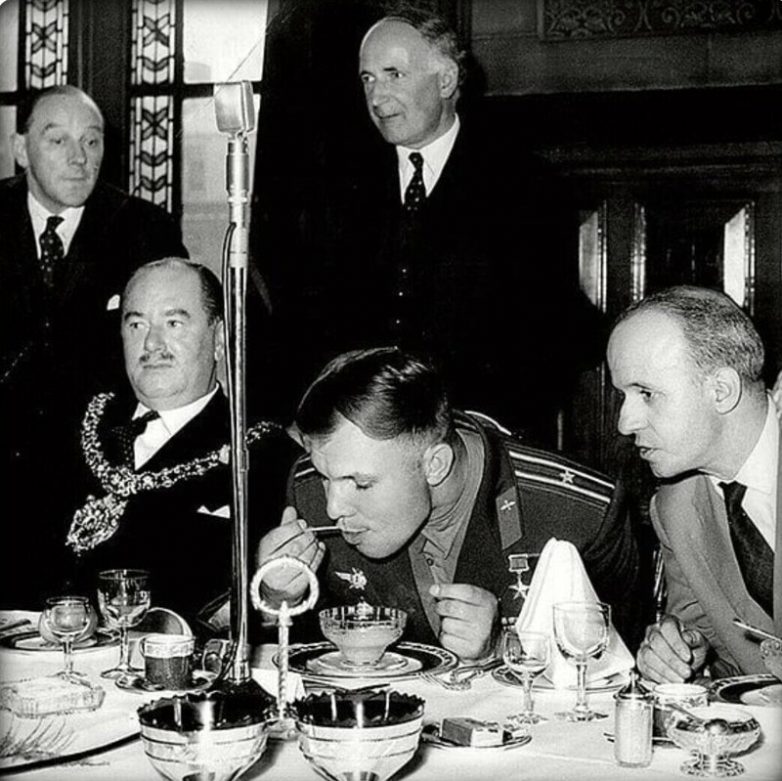 Пройдя к обеденному столу, так же в нарушении протокола, королева усаживает Гагарина рядом с собой, а принца Филиппа напротив. Сервировка королевского стола была Гагарину не знакома и все пристально смотрели на почетного гостя. Не растерявшись, он с улыбкой сказал «давайте есть по-русски» и положил себе салат ложкой. Улыбнувшись в ответ, королева сказала всем: «Господа, давайте есть по-Гагарински».