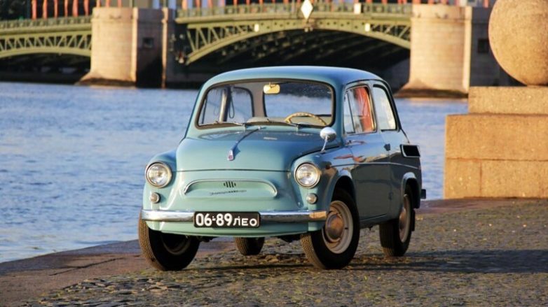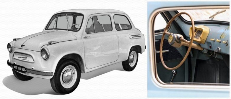 ЗАЗ‑965, 1960 год. Заднемоторная компоновка. Двигатель — воздушного охлаждения, четырехцилиндровый, V‑образный. Рабочий объем 0,76 литра, мощность 23 л.с., позднее — 0,9 литра, 27 л.с. Подвеска независимая: спереди — поперечные торсионы, сзади — пружины. Кузов несущий.