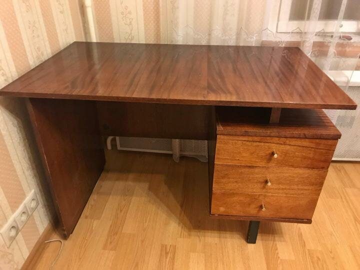 Крепкий письменный стол с ящиками послужит вам для работы дома. Возможно, придётся обновить лак или покрыть стол специальным маслом, сохраняя его первоначальный вид. Вообще, стол из массива или бюро — это настоящая редкость и украшение для любого современного интерьера.