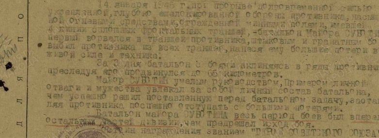 Свой главный героический подвиг Субботин совершил в ходе Висло-Одерской операции в январе 1945-го. Батальон под командованием Павла Захаровича за 10 часов прорвал оборону в районе города Пулавы, выбив врага из 10 траншей, в том числе в ходе рукопашных и штыковых боев.