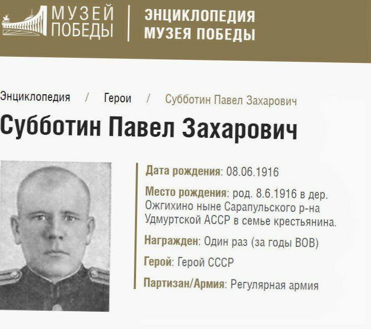 Павел Захарович вновь оказался в госпитале, где и встретил весть о победе. После войны он вернулся в Удмуртию, где прожил еще 10 лет, в 1955 году героя не стало. В Ижевске в 2011 году установлен монумент в память о Субботине.