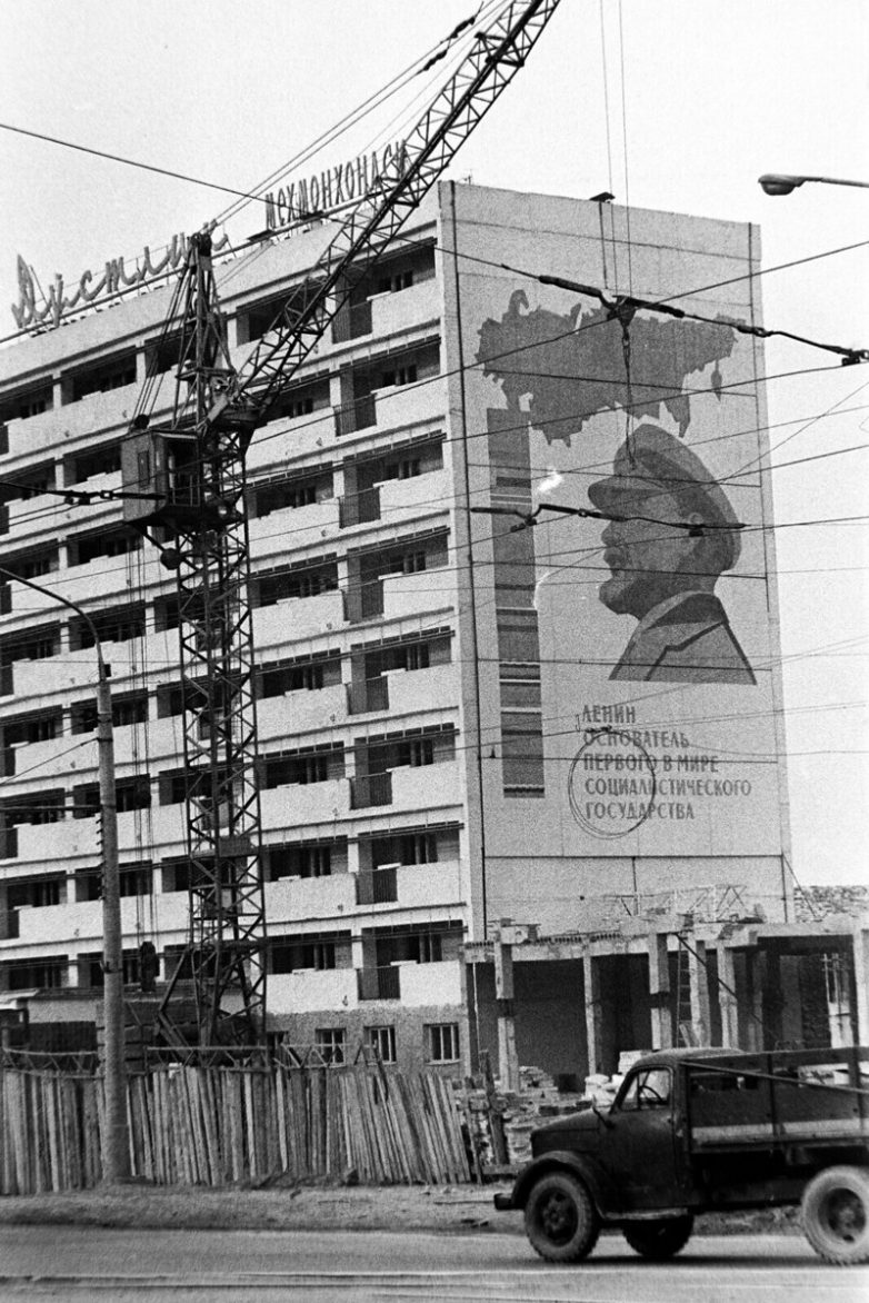1967 год. Алма-Ата. Проспект Абая, напротив памятника Абаю Кунанбаеву, на заднем плане строится Дворец культуры им.Ленина