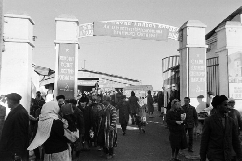 На левом столбе ворот Колхозного рынка надпись на Узбекском — «Да здравствуют Советские женщины».
