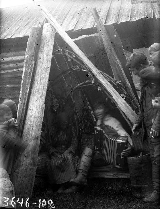 На этом фото шалаш для жениха и невесты, построенный во время свадьбы. Такие фото я уже встречала, на на вскидку не вспомню, где. Но в целом постройка такого шалаша, символизирующего, по видимому, будущий дом и семейную жизнь, встречается у многих народов.