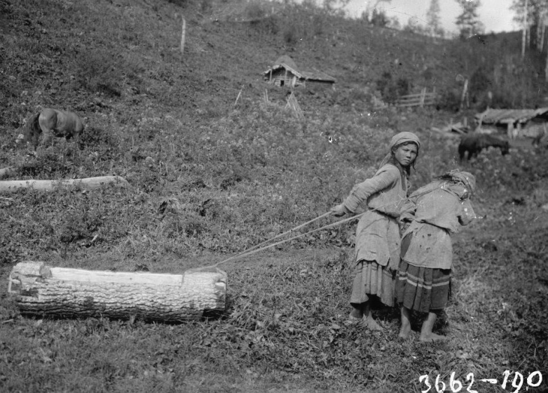 Девушки перевозят колоду для воды для скота. Раньше не задумывалась о том, как поили и кормили скот, из каких корыт. Но вот попался один из интересных и довольно эффективных вариантов. Переносить такую колоду не просто, зато делать, по-видимому, довольно легко.
