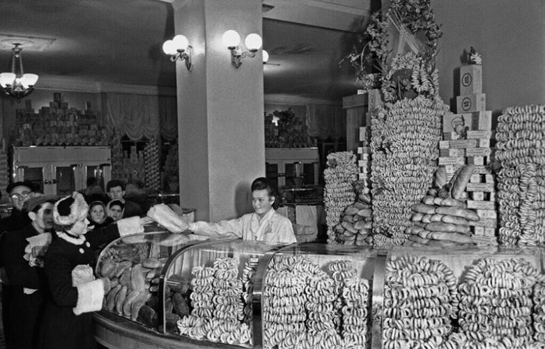 Оживленная торговля в хлебном отделе гастронома № 2 в первые дни после отмены продовольственных карточек. Александр Устинов, 1947 год, г. Москва, Союз фотохудожников России