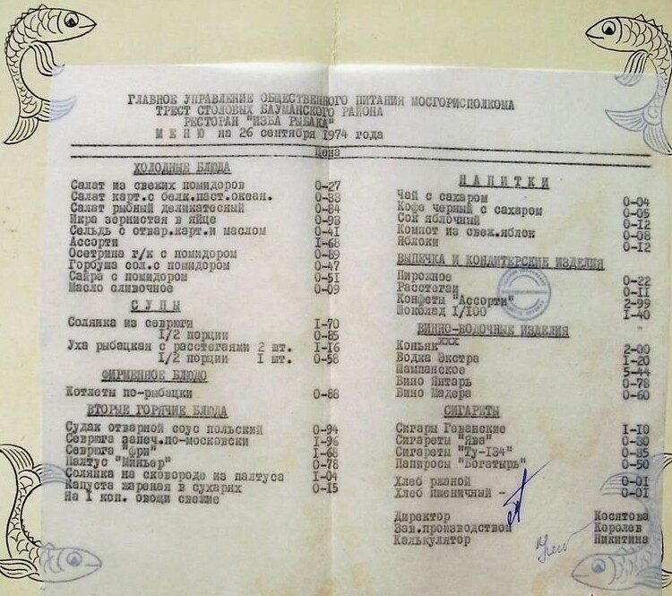 И все в таком роде — уха рыбацкая с расстегаями — 1 рубль 16 копеек, Палтус «Миньер» — 78 копеек, Осетрина горячего копчения — 89 копеек. Наслаждайтесь!