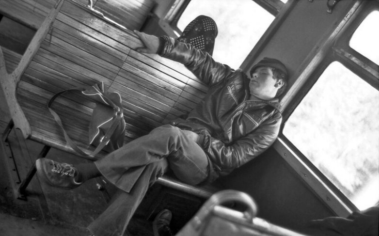 Пассажир. Вагон электрички, которая едет в сторону Киевского вокзала. Октябрь 1977 года. Фотограф Сергей Сухарев.