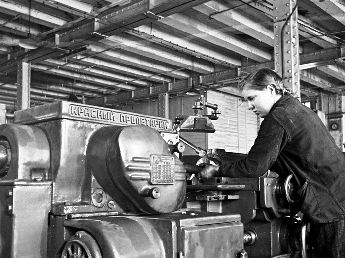 В механо-сборочном цехе стахановка токарь Валентина Шепелева за работой. 1949 г. Обратите внимание, как называется станок, „Красный пролетарий“. Разве можно на таком работать, спустя рукава? Конечно, нет. Вот поэтому и трудалась Валентина по-стахановски :)