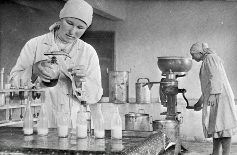 Проверка качества молока заведующей колхозной молочной фермой. СССР, Украина, Чапаевск, 30-е.