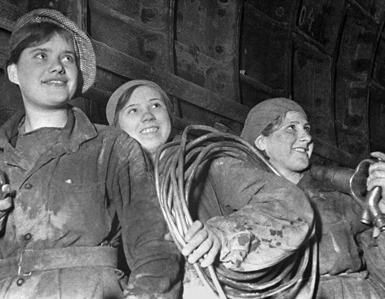 Идея метро в Москве появилась ещё в 1875 году. Хотели проложить ветку от от Курского вокзала до Марьиной рощи. Но до реализации дело так и не дошло — против активно выступила Церковь. В итоге, первый опытный участок метро начали строить в 1931 году. И, конечно, наши барышни и тут, наравне с мужчинами выполняют и перевыполняют план.