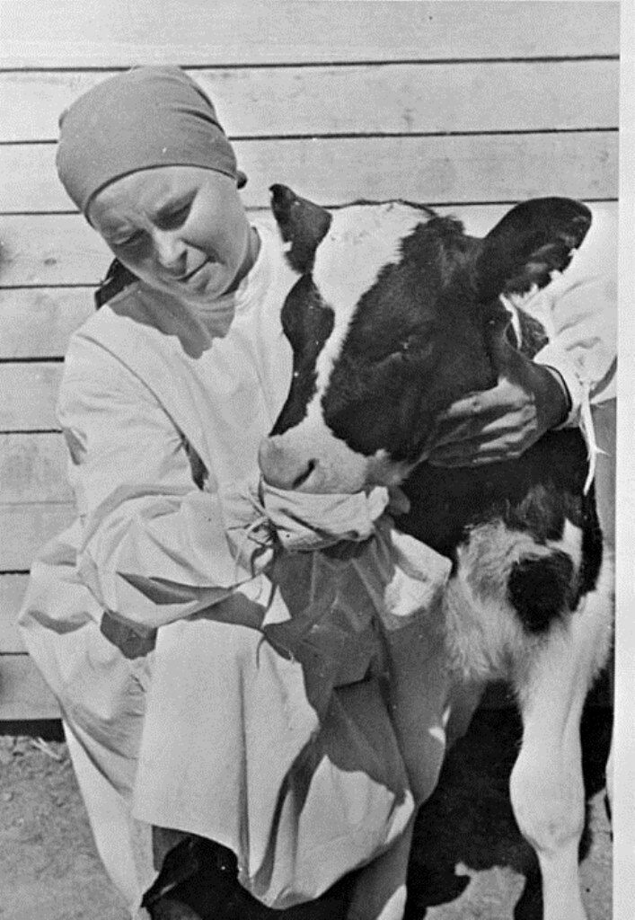 (Доярка вытирает морду теленку после кормления. СССР, 30-е годы)