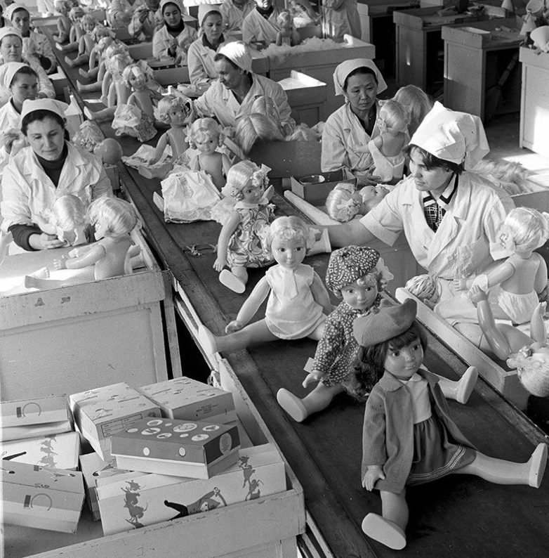 Сегодня я совсем другими глазами смотрю на игрушки СССР. Не все, конечно, но многие очень достойные экземпляры. Посмотрите только на этих красавиц. Кукольный конвейер на Алма-Атинской фабрике игрушек, 1970-е годы. Какие модные куклы — плащи, береты.