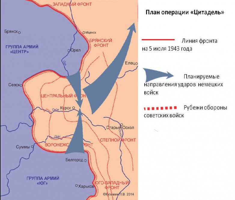 Советское командование прекрасно осознавало угрозу, тем более что разведданные подтверждали концентрацию противника у оснований дуги. Можно было наступательными действиями попытаться выровнять линию фронта. Но Жуков, Василевский и Антонов предложили Сталину другой план – активной, подготовленной обороной обескровить врага и лишь, затем перейти в контрнаступление. «Лучше будет, если мы измотаем противника на нашей обороне, выбьем ему танки, а затем, введя свежие резервы, переходом в общее наступление окончательно добьем основную группировку противника». Сталин хоть и был сторонником немедленных наступательных действий, но помня неудачные летние действия 41 и 42 года, когда наступления против крупных ударных группировок немцев были совершенно безуспешны, согласился с единодушным мнением высших военачальников.