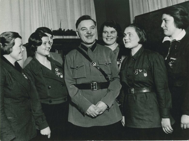 1935. Нарком обороны СССР К.Е. Ворошилов встречается с комсомолками, награждёнными почётным знаком «Ворошиловский стрелок» 1 ноября