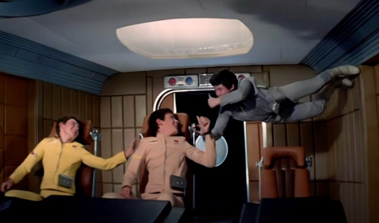 О, это особенное блюдо! К съемкам семейной фантастики Ричард Викторов подошел с огромным вниманием и серьезностью к деталям. Так что, не даром картина вошла в «золотой фонд» советского кино и по праву является культовой. Как вам то, что, например, для пробежки в невесомости в коридоре (на фото) была смонтирована восемнадцатиметровая декорация, размещенная на множестве роликовых опор. В итоге, во время работы камеры коридор вращался на 360-градусов, а космонавт закреплялся на стене через суперклей на подошвах ботинок – а после его в полуприсяде закрывал другой актер, бегущий по спирали. Все это создало удивительный эффект присутствия, после которого хотелось лишь воскликнуть «браво!».