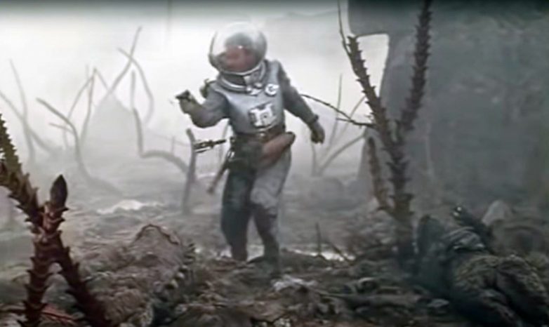 Лебединая песня советского визуального кино – далее, почему то, в серьезные спецэффекты большинство творцов вкладываться перестали (да и в «Через тернии с звёздам» бюджет сильно порезали – скажем, спускаемый с орбиты флаер так и не удалось показать). Что ж, зато получилась биомасса – сделанная из противопожарной пены и муки и «оживлённая» (да-да) плавающими в ней аквалангистами.