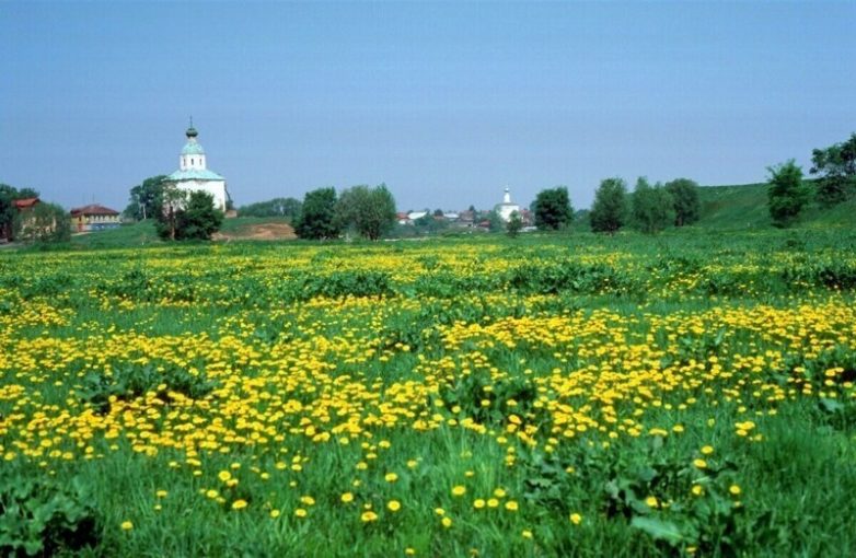 Церковь Святого Ильи в Суздале на фоне поля из одуванчиков, 1985 год.