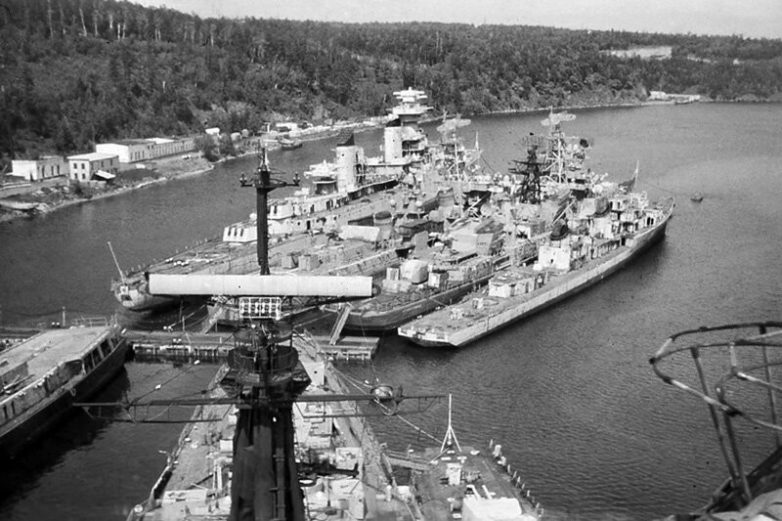 На этом старом фото в бухте Западная ещё стоят на консервации крейсер Александр Суворов проекта 68-бис, эскадренный миноносец проекта 30-бис, и эскадренный миноносец «Упорный» проекта 57-А.