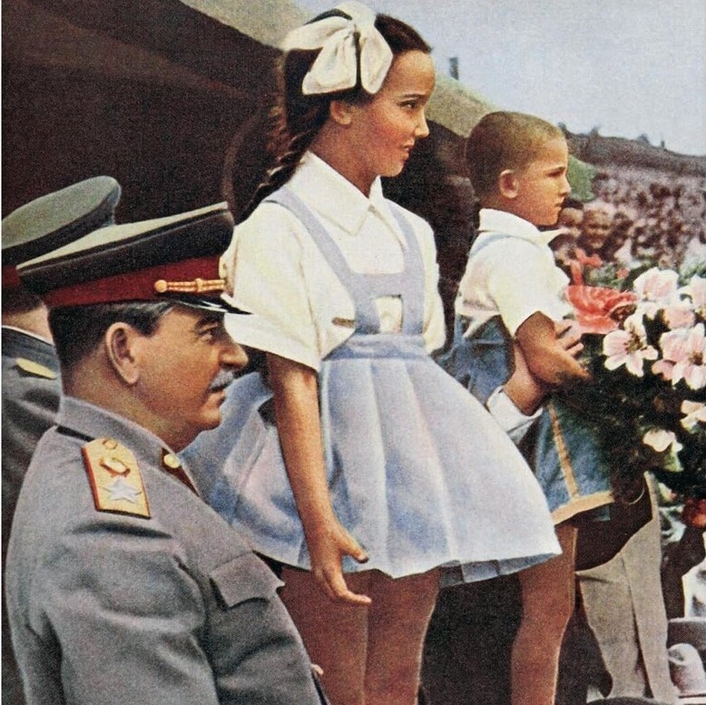 1946. Иосиф Виссарионович Сталин принимает цветы от московских школьников на Всесоюзном параде физкультурников. Красная площадь