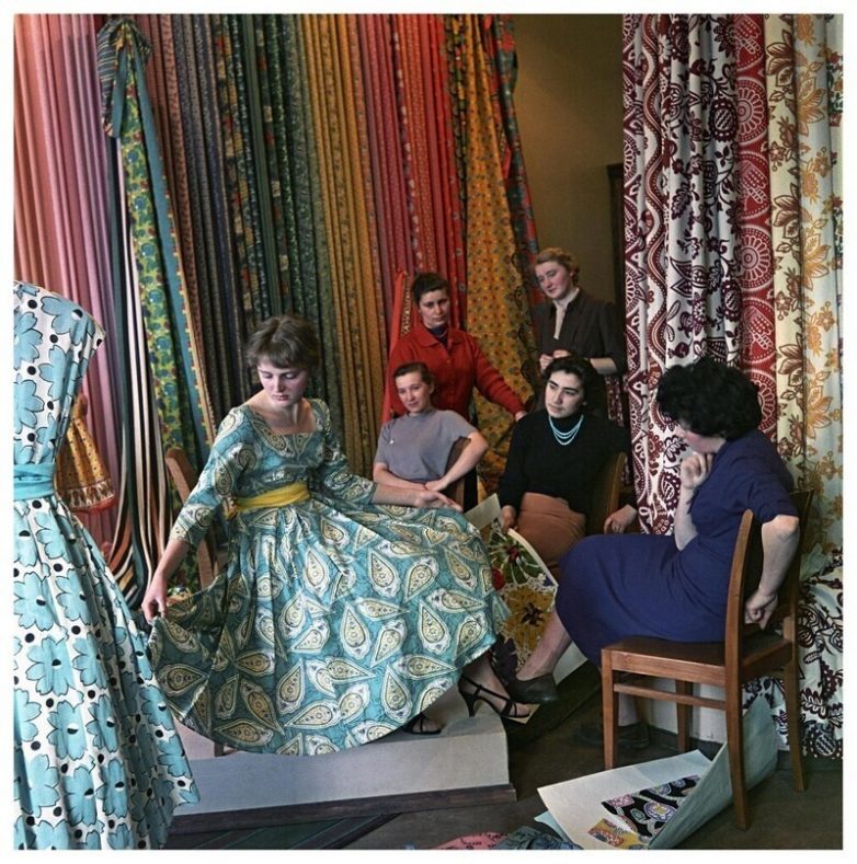 1959. Комбинат «Трехгорная мануфактура». В ассортиментном кабинете художница И. Годунова демонстрирует платье из ткани нового рисунка.