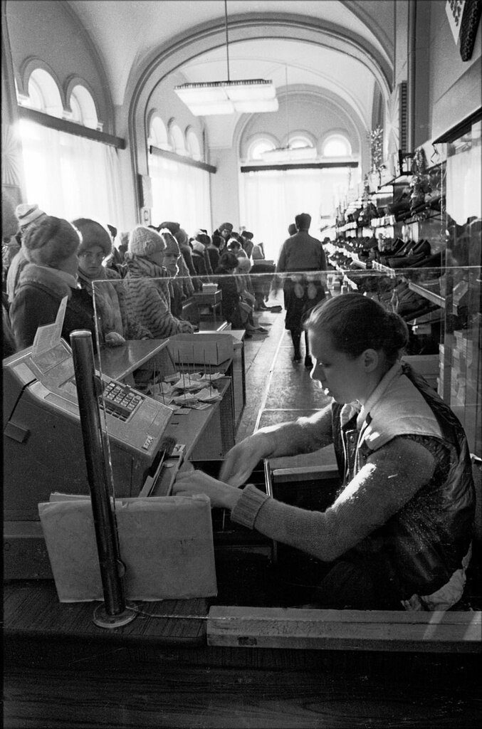 ГУМ. Касса в обувном отделе. Игорь Стомахин, 23 декабря 1991 года, г. Москва, Красная пл., д. 3, из архива Игоря Стомахина.