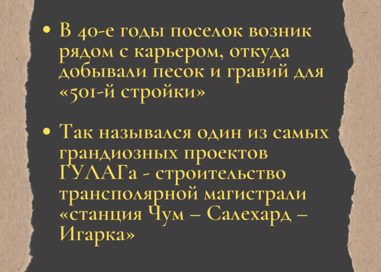 «На станции, о которой объявляет проводница, некому встречать и провожать пассажиров. Поселок Полярный, удостоившийся в расписании названия «110-й километр», давно исчез с карты.» === Предполагалось, что поселок Полярный занят военной ракетной базой. Пусть так оно и будет в памяти геологов, которые выехали в те годы со 106-го в Салехард, Тюмень, Воркуту и Свердловск. 1961 год однако :) «Ликвидацией Харбейской геолого-разведочной партии с мокрой консервацией (затоплением) подземных горных работ в 1955 году завершается первый, молибденовый этап жизни пос. Полярный, этап под печатью НКВД СССР. В связи со сменой политической обстановки в стране, упразднением сил НКВД и системы ГУЛАГа, Полярно-Уральская геолого-разведочная экспедиция была передана Уральскому территориальному геологическому управлению и, фактически, закрыта. Посёлок Полярный на 106-м км железной дороги «Чум — Лабытнанги» стал в первый раз никому не нужен и опустел.»
