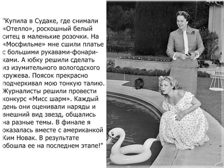 Несмотря не беспросветный советский дефицит, наши актрисы на международных кинофестивалях всегда выглядели шикарно — доктор, а вы с головой дружите? Страна только начала оправляться от ужасной войны, а вы тут пишете в начале статьи какую то ересь, про дефицит. Людей которые представляли СССР за рубежом на фестивалях одевали дома мод СССР в которых работали очень замечательные модельеры или вы об этом не слышали? К примеру тот же Вячеслав Зайцев, ах ну да вы не с того времени :)