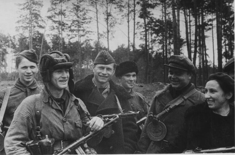 Смеющиеся партизаны. Крайняя справа – командир отряда Варвара Вырвич (Катя). 1943 год. Автор: Сергей Коршунов.